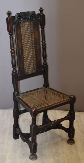 Charles II or William & Mary cane seated chair, with carved foliate crown or similar motif to top, H117cm, together with Chippendale style mahogany dining chair