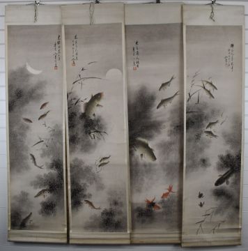 Four early to mid 20thC Chinese scroll paintings depicting fish, with script and seal mark, 145 x 42cm