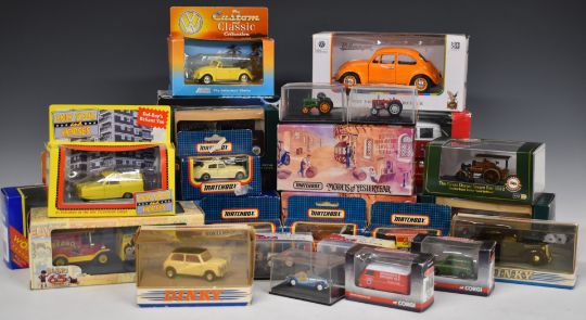 Thirty Corgi, Matchbox, Dinky, Saico and similar diecast model cars, all in original boxes.