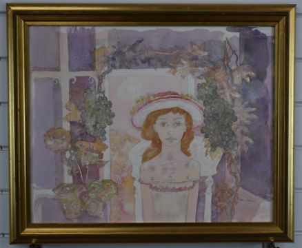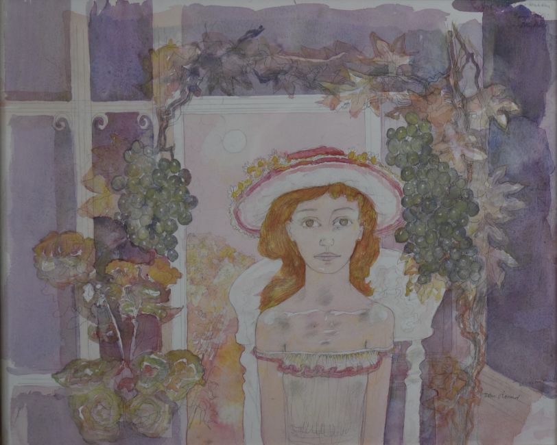 John O'Conner (1913-2004) three watercolour portraits comprising woman with sunflowers, woman by a Gothic window and oil lamp and woman wearing a hat in a doorway, all signed lower right, largest 44 x 54cm, in gilt frames