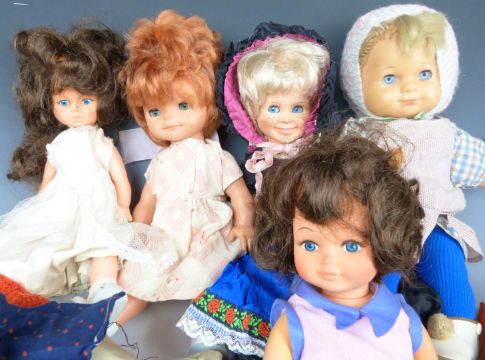 Four Mattel, Playmates and similar soft plastic dolls together with a collection of doll's clothing and outfits.