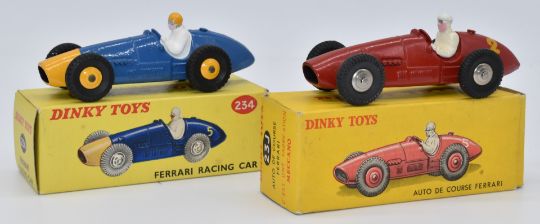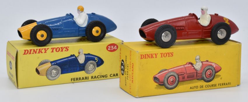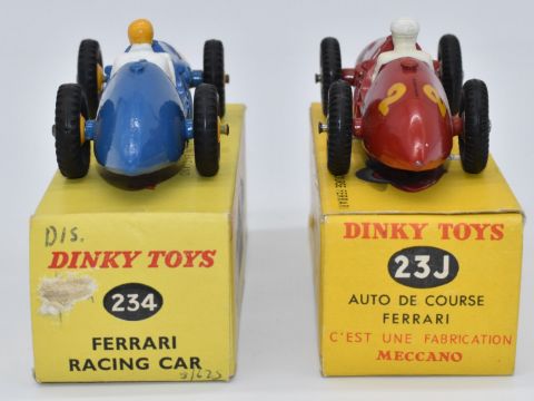 Two Dinky Toys diecast model vehicles Auto De Course Ferrari with red body, white driver and racing number '2' 23J, and Ferrari Racing Car with blue and yellow body and white and yellow driver 234, both in original boxes.