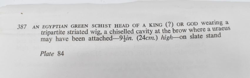 Egyptian green schist head carved in the form of king or God wearing a tripartite striated wig and having a chiselled cavity at the brow where a uraeus may have been attached, 24cm high, purchased from Christies on Wednesday June 14th 1978 with original Christies catalogue