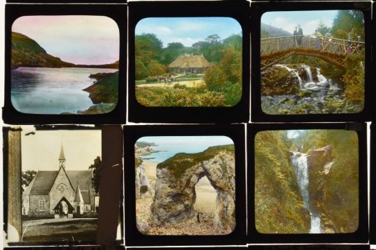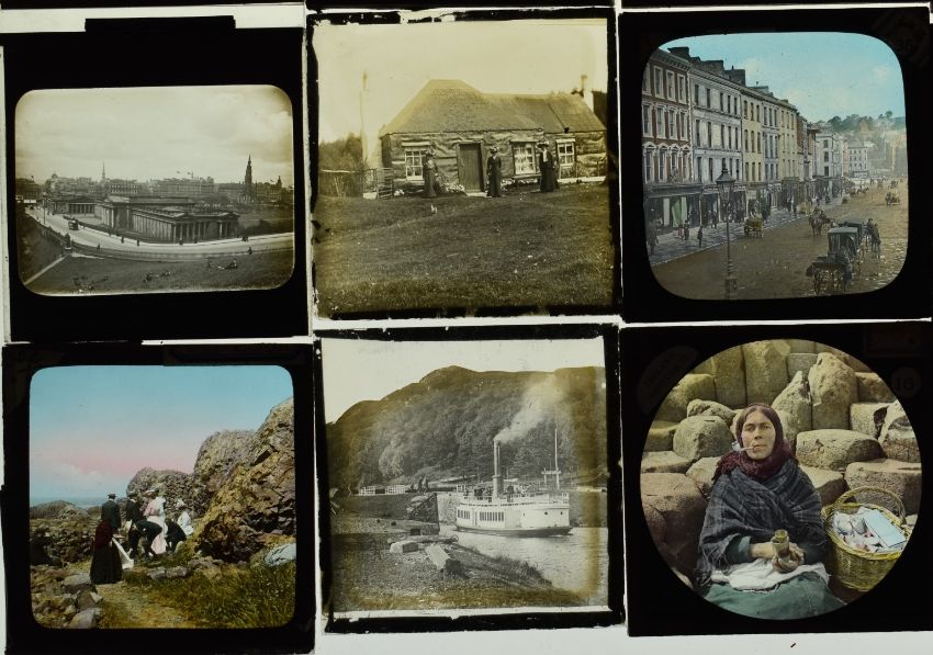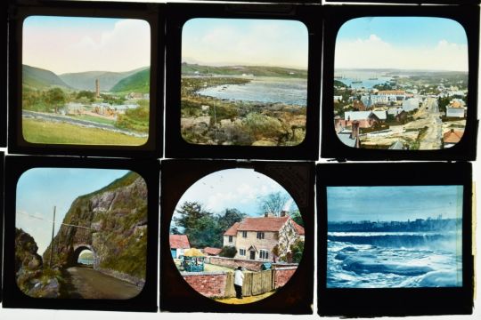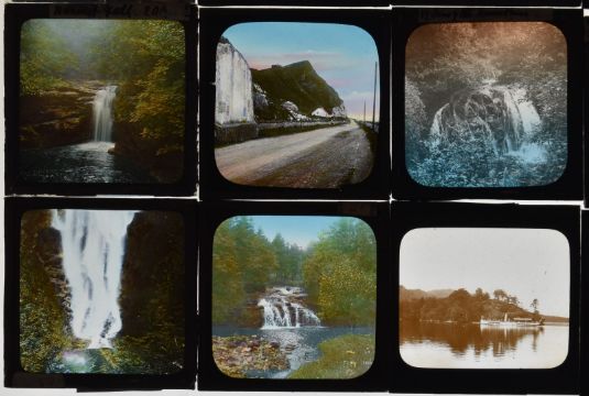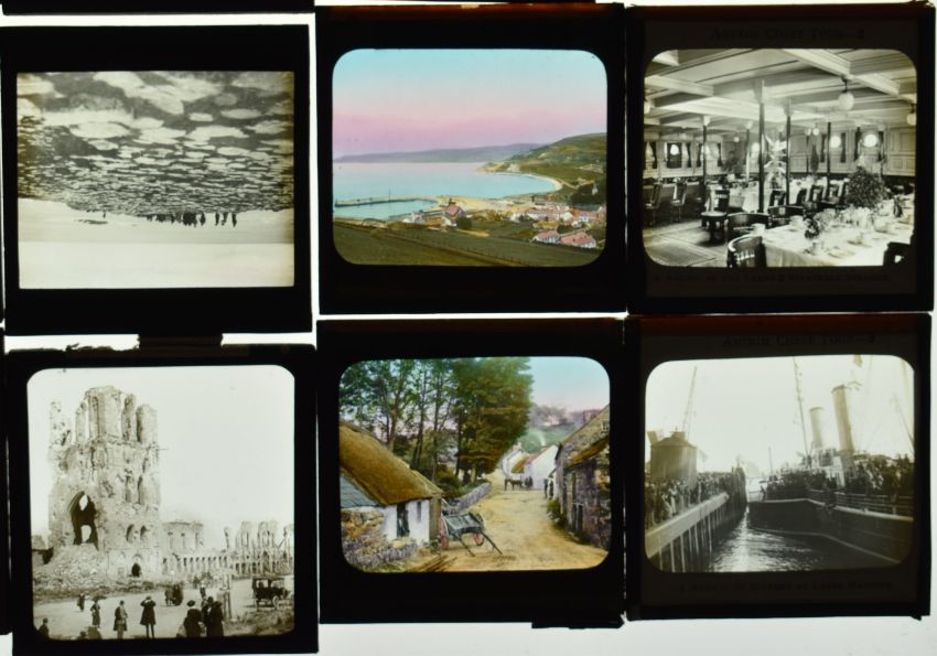 Glass magic lantern slides to include waterfalls, Portrush, Antrim coast and other Irish examples, steam ships, Giants Causeway railway, Scottish scenes, Lake Superior, destroyed WW1 tank etc