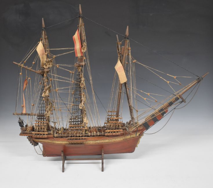 Two wooden models of a three masted sailing ships, largest 64cm tall.