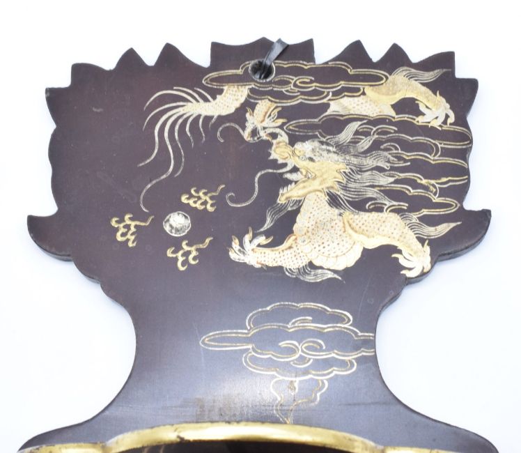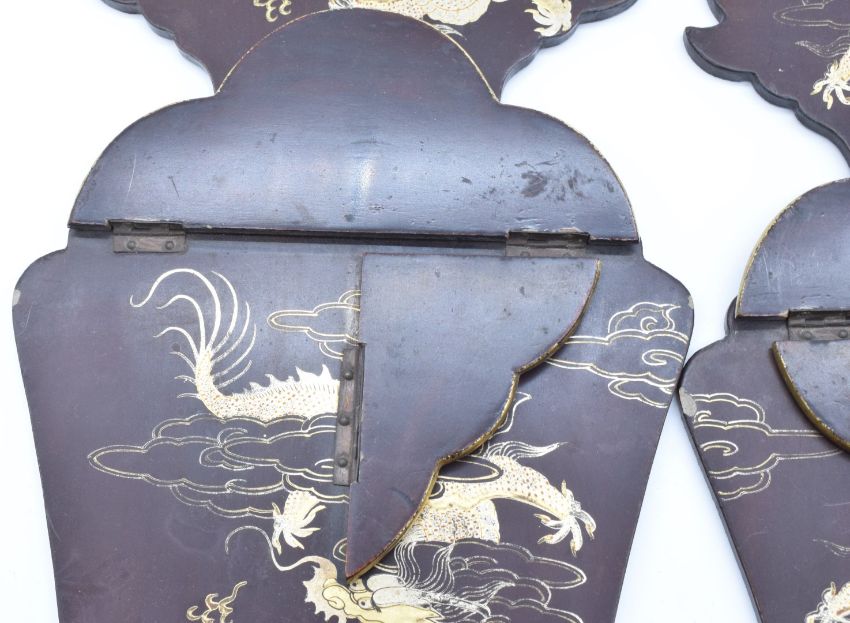 A pair of Japanese Meiji period lacquer wall brackets with folding shelves and gilt decoration depicting a dragon chasing a flaming pearl, 41.5 x 20cm