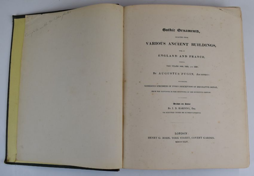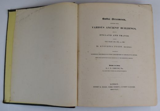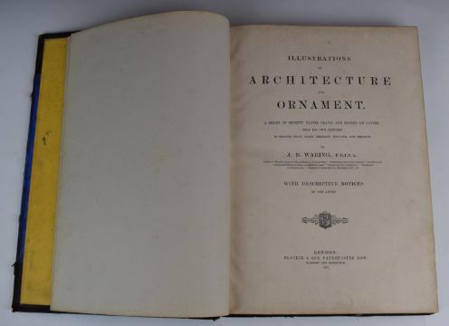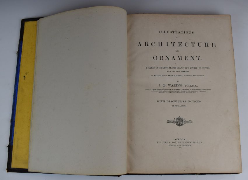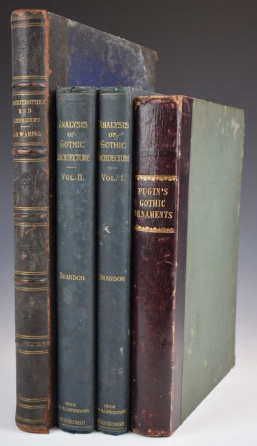 Gothic Ornaments Selected from Various Ancient Buildings both in England & France by Augustus Pugin, Architect drawn on stone by J.D. Harding published Bohn 1844 first edition illustrated with 91 plates in leather backed cloth boards gilt title, Illustrations of Architecture & Ornament a series of 70 plates drawn & etched on Copper from his own sketches in France, Italy, Spain, Germany, Holland and Belgium by J.B. Waring, published Blackie 1871 first edition in half leather (folio), An Analysis of Gothic Architecture Illustrated by a series of upwards of 700 examples of Doorways, Windows, Mouldings, Roofs, Arches etc by Raphael & J. Arthur Brandon 1903 New Edition in 2 volumes gilt lettered cloth (4)