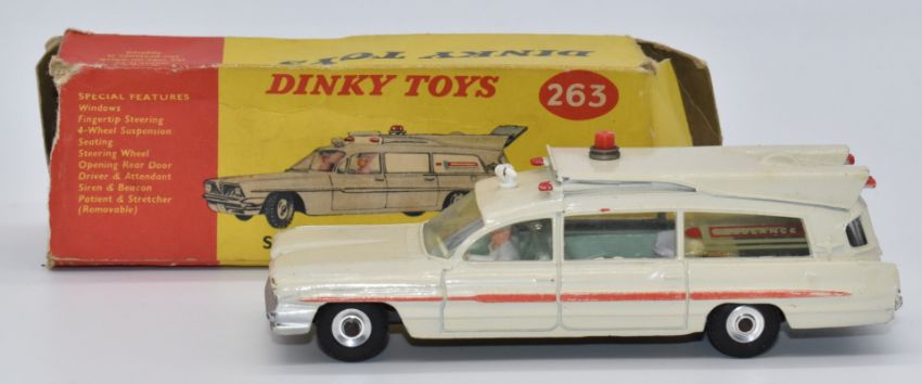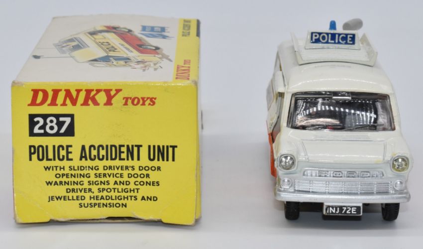 Two Dinky Toys diecast model vehicles Superior Criterion Ambulance with cream body, red stripe, two drivers and passenger on stretcher 263 and Police Accident Unit with Sliding Driver's Door, Opening Service Door, Warning Signs and Cones, Driver, Spotlight, Jewelled Headlights and Suspension 287, both in original boxes.