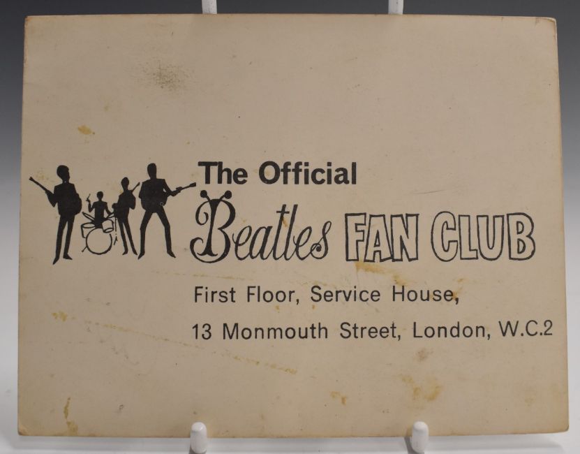 Beatles Fan Club postcard signed John Lennon, Paul McCartney, George Harrison and Ringo Starr, in the hand of Beatles' road manager Neil Aspinall. Presented to the vendor by Andreas Malandrinos, who played the Austrian waiter in the film Help!, 10.5 x 14cm.