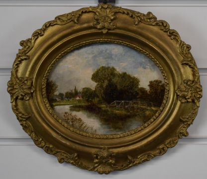 Pair of 19thC oil on board landscapes, one a river scene with footbridge the other other a similar scene with church or cathedral beyond, maximum diameter 16.5cm, in ornate gilt frames