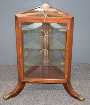Late 19th or early 20thC inlaid mahogany triangular glazed display cabinet with three glass shelves, the lower two supported on scrolling brackets, with opening door to one side, raised on sweeping feet terminating in gilt lion paws, the top fitted with a cut glass finial, W83, H86cm