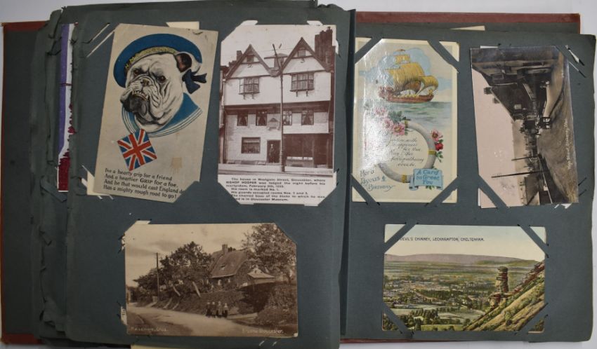 Two Edwardian postcard albums with humorous, topographical, military, Gloucestershire cards to include multiple Mabel Lucie Attwell, Newnham on Severn (interesting street scene), Nurse's Home Lansdown Road, children bathing in the Severn, Gloucester, Maisemore soldiers 1919, advertising, dogs, cats, Agnes Richardson, flood at Gloucester, Donald McGill, Chloe Preston, etc, approximately 420 cards