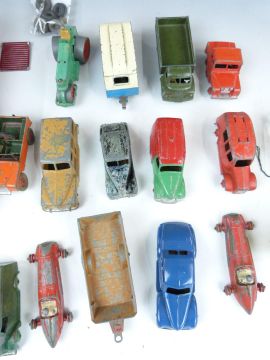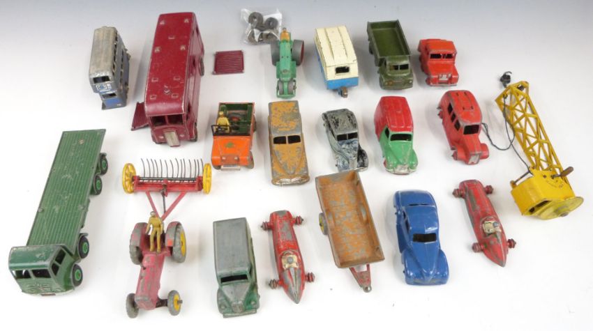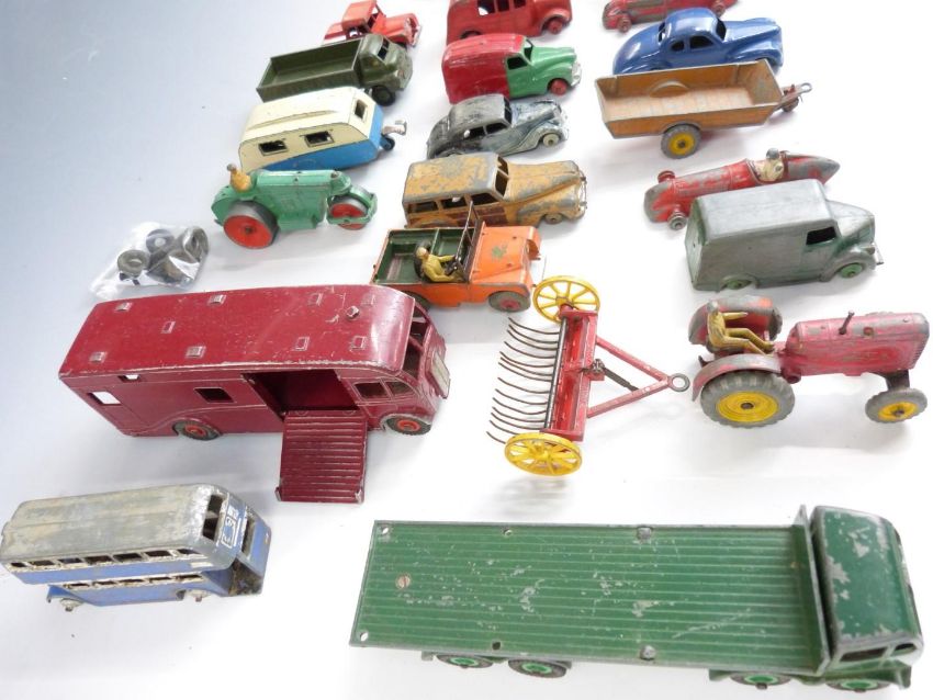 Twenty Dinky Toys diecast model vehicles including Foden flatbed lorry, Studebaker, double decker bus, Express Horse Box Hire Service etc