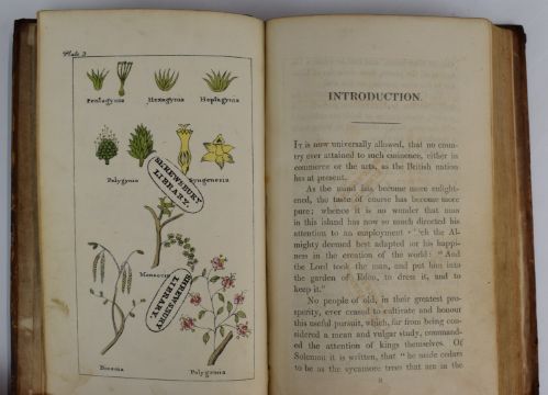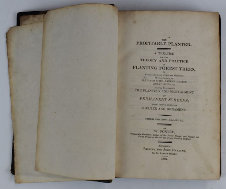 The Profitable Planter. A Treatise on the Theory & Practice of Planting Forest Trees by W. Pontey 1809 third edition enlarged bound with Pontey's The Forest Pruner; or Timber Owners Assistant: A Treatise on the Training or Management of British Timber Trees 1808 second edition with several plates (including three folding in colour) bound in half leather with raised bands and gilt decorated spine, Pomarium Britannicum An Historical & Botanical Account of Fruits Known in Great Britain by Henry Phillips, 1822 second edition with three hand-coloured plates bound in leather backed boards (2)
