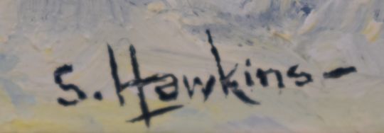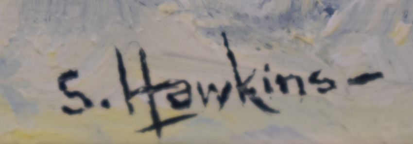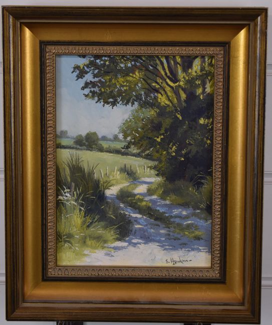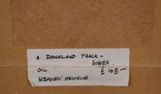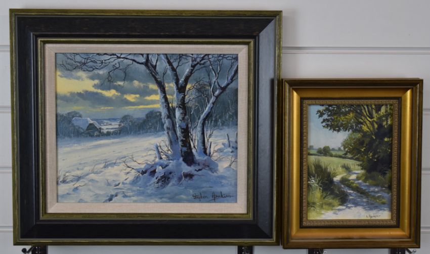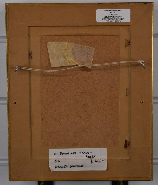 Two Stephen Hawkins oil paintings, one 'A Downland Track- Sussex' and 'A Cold Winter's Evening', both signed lower right, larger 24 x 29cm, both in part gilt frames with labels verso