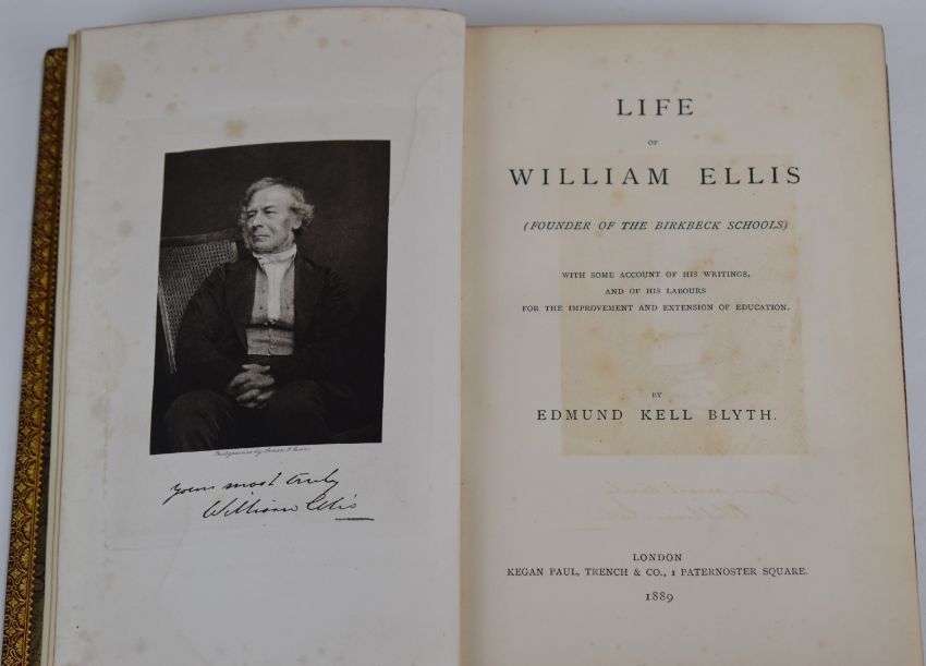 [Fore-edge Painting/Royalty Ownership] Life of William Ellis, founder of Birkbeck Schools by Edmund Kell Blythe 1889, bound by Riviere in contemporary full Morocco gilt ruled border with raised bands & gilt spine PRESENTATION COPY to Her Royal Highness The Princess Christian of Schleswig-Holstein (Princess Helena of Great Britain & Ireland) from the Author – with her bookplate pastedown WITH FORE-EDGE PAINTING of Windsor Castle and town, coach & horses, farmers and other figures in the foreground