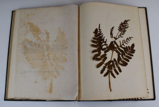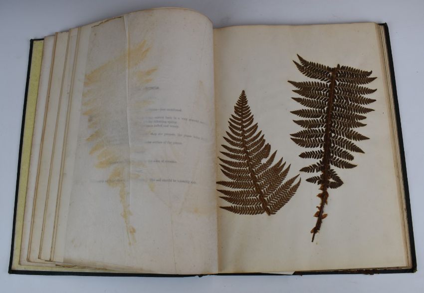 [Botany] The Ferns of Wales by Edward Young printed & published by Thomas Thomas 1856 first edition with a colour pictorial title and containing 34 examples of real original pressed ferns with printed descriptions and tissue guards, bound in original Morocco cloth with gilt decorations and titles, the plates in remarkable condition considering their delicate nature