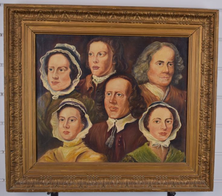 After Hogarth oil on canvas portrait of six people 'Servants', with details indistinctly marked verso, 42 x 50cm, in gilt frame