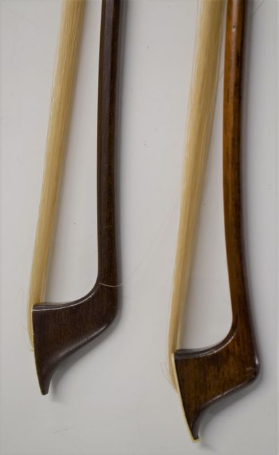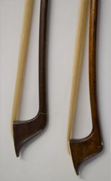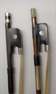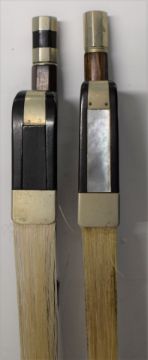 Unnamed nickel and ebony mounted double bass bow, octagonal stick, L66.4cm, 129g, together with a round stick example for restoration, L67.8cm, 126g