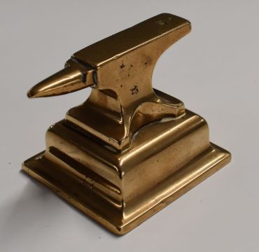 Victorian silver horticultural medal in case, novelty miniature bronze blacksmith's anvil, 1916 shell case base and a hand bell, tallest 23cm