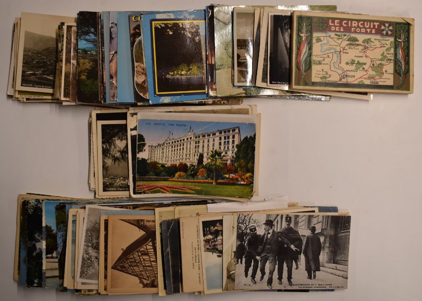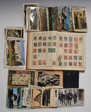 Lincoln all world stamp album, a similar collection of postcards and a leather wallet with swastika emblem