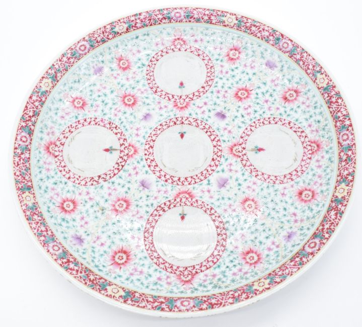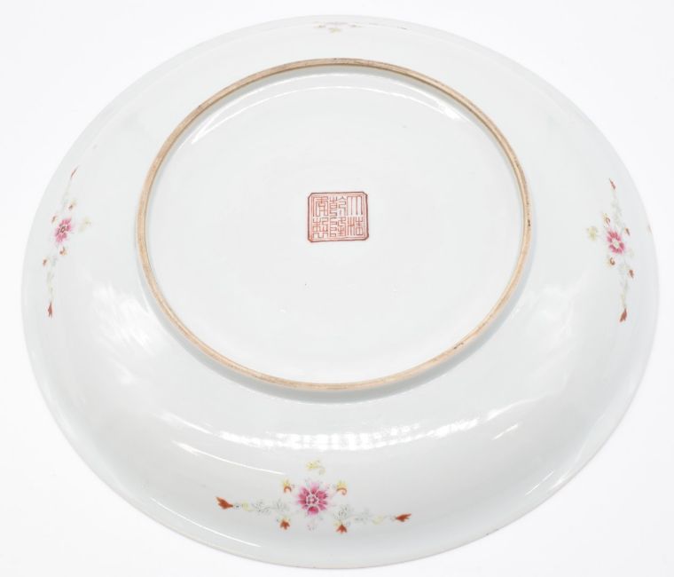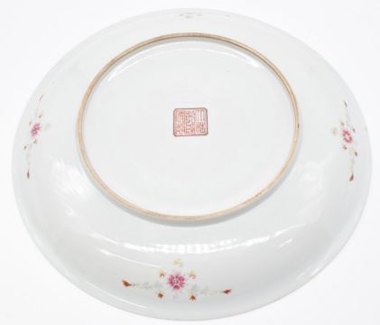 Chinese late 19th/20thC famille rose charger decorated with owls and flowers, with red iron Qianlong seal mark to base, diameter 36cm