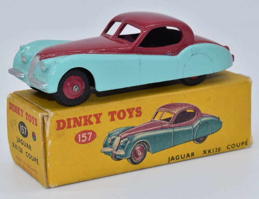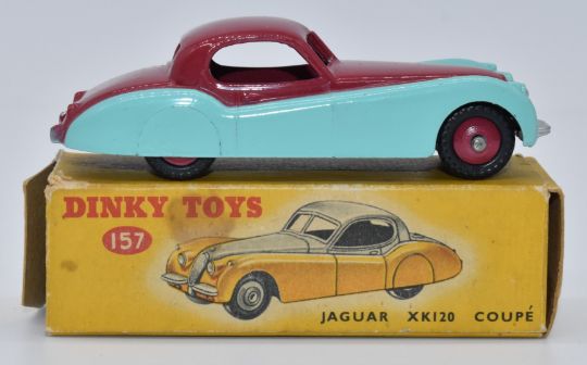 Dinky Toys diecast model Jaguar XK120 Coupé with two-tone turquoise and cerise body, 157, in original box.