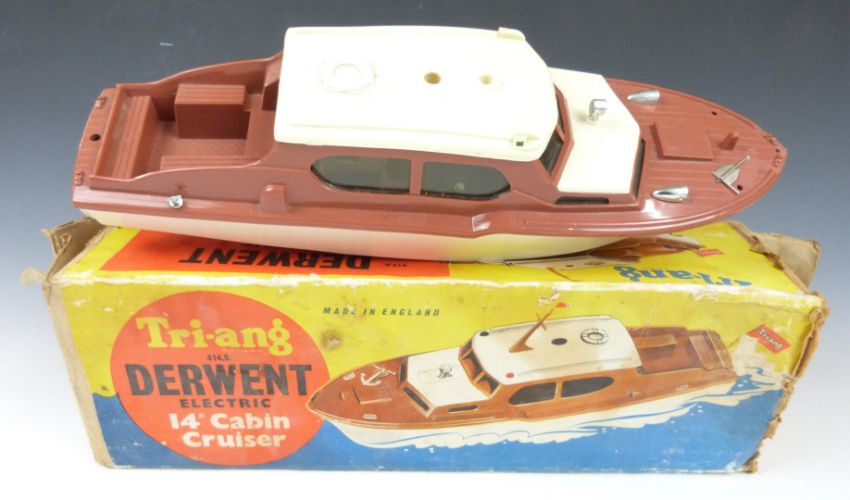 Three battery operated model boats to Tri-ang Derwent Electric 14" Cabin Cruiser, Victory Industries Vosper RAF Crash Tender and Holiday-Launch, all in original boxes.