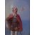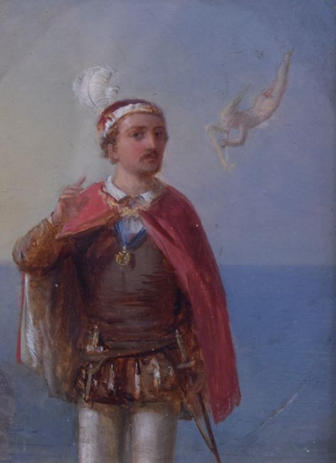 19thC oil on canvas portrait of a man with sword, dagger and order or similar medal with cape and feather headdress, with putti in flight playing a harp in the sky above, the man standing before a calm sea, 15.5 x 12cm, in ornate period gilt frame