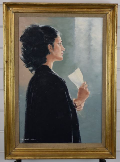 Guy Gravett (1916-1996) oil on board Jill Gomez at Glynbourne, signed and dated 1977 lower left, 60 x 39cm, with title verso. Gravett was photographer at Glynbourne for 40 years
