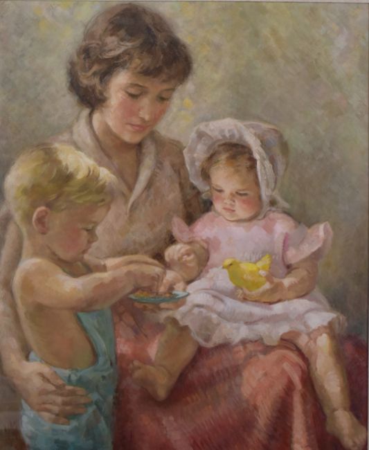 Denys George Wells (1881-1973) oil on canvas mother and children 'Maternal Love', with information and date 1952 verso, 74 x 59cm, in painted wooden frame