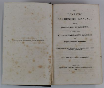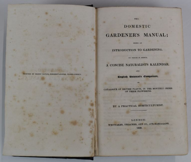 The Domestic Gardener’s Manual; Being An Introduction to Gardening To which is added, A Concise Naturalist’s Kalendar and English Botanist’s Companion or Catalogue of British Plants in the Monthly Order of their Flowering by a Practical Horticulturist [George John Towers], published Whittaker Treacher & Co 1830 first edition in cloth with gilt lettered leather label on spine
