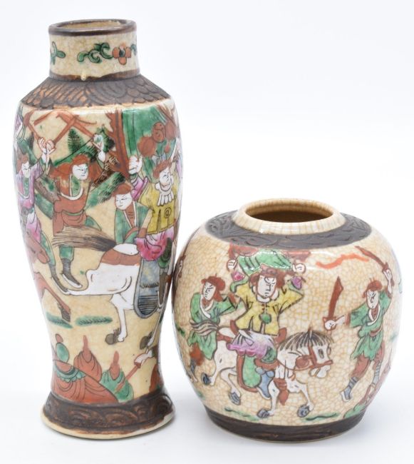 Chinese crackle glaze ginger jar and matching vase, both decorated with battle scenes, largest 22cm tall