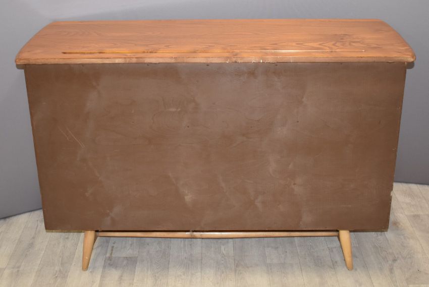 Ercol style retro / mid century modern light elm panelled sideboard raised on slender tapering legs, W130 x D50 x H87cm
