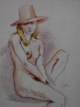 Guy Roddon (1919-2006) watercolour portrait of a seated nude woman wearing a hat, signed lower right, 39 x 28cm