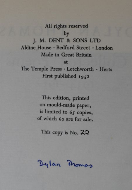 [SIGNED] Dylan Thomas Collected Poems 1934-1952 published J.M. Dent 1952 first edition, this copy one of only 65 printed on mould-made paper and SIGNED by Dylan Thomas on limitation leaf (copy 20) with frontispiece portrait of the author by Augustus John and bound in full Morocco leather with gilt title