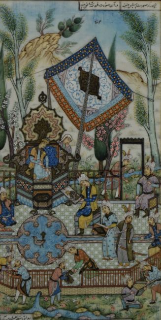 Persian painting of figures in an outdoor setting, signed to top and bottom, in inlaid Vizagapatam frame, 35 x 18cm