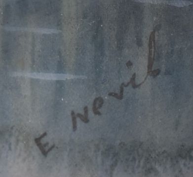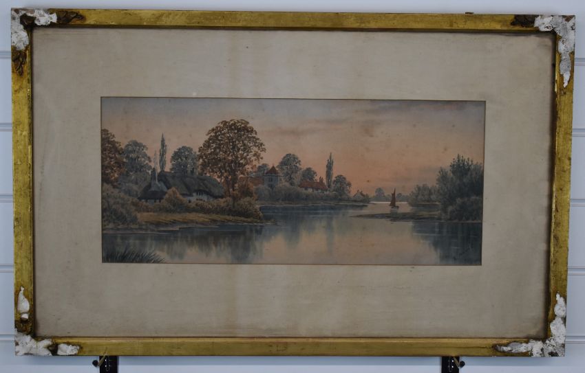 Edward Nevil (19th or early 20thC) watercolour landscape with village beside a river, possibly the Norfolk broads, signed lower right, 23 x 53cm, in gilt frame