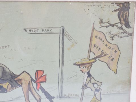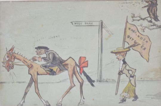 Suffragette and political interest watercolour cartoon of particular interest to Harpenden, featuring a gentleman on a horse with his wife following behind carrying a flag “Harpenden Pittites”, travelling past a Hyde Park signpost and asking his wife “Alice where art thou?” her response “Coming”, jackdaw with caption top right “everybody’s doing it” referencing the voting in the 1918 election.The women of Harpenden were denied the chance to vote during the December 1918 general election because their incumbent MP Sir E Hildred Carlile was unopposed, hence the use of the word Pittite, meaning a spectator at the theatre, referencing the womens' ability to observe the election but not vote (15 x 23cm)
