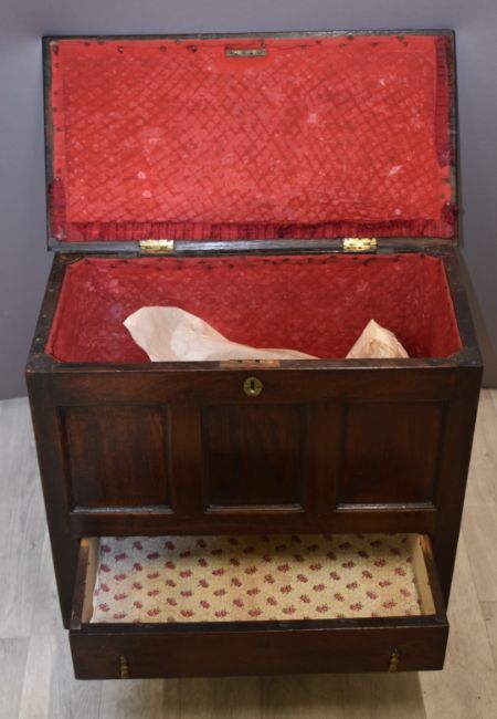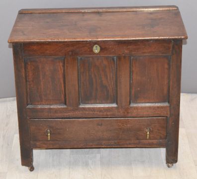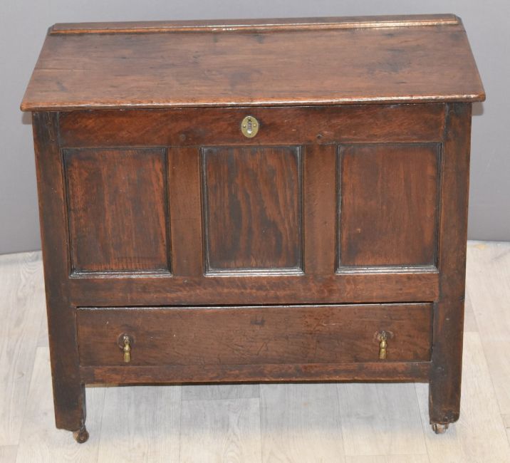 18th/19thC oak bachelor's or novelty miniature apprentice mule chest with panelled front and single drawer below, W64 x D33 x H57cm