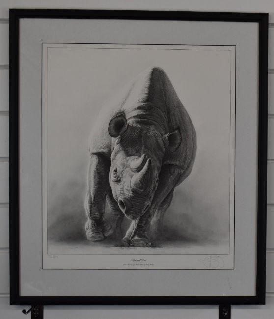 Gary Hodges (b1954) signed limited edition print Heat and Dust (332/850) rhinoceros, 49 x 42cm, in black frame
