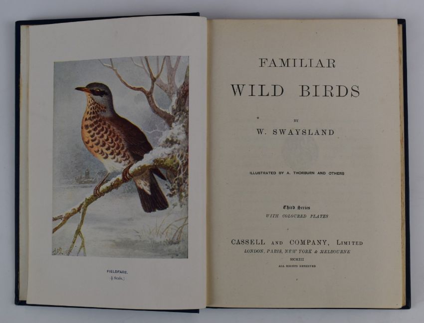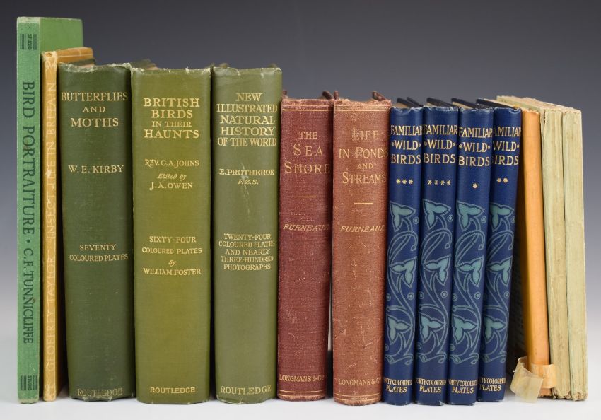 Familiar Wild Birds by W. Swaysland illustrated by A. Thorburn & others with coloured plates 1903, in 4 volumes bound in decorated cloth with gilt titles, British Birds In their Haunts by Late Rev. C.A. Johns with 64 coloured plates in gilt cloth, Butterflies & Moths by W.E. Kirby with 70 coloured plates Routledge (c.1900) in gilt cloth, The Sea Shore by Furneaux 1903, Bird Portraiture by Tunnicliffe 1945, New Illustrated Natural History of the World by Protheros (c.1900) with 24 coloured plates and nearly 300 photographs in gilt cloth and 3 parts of Lloyd's Natural History of Butterflies and 2 others (14)