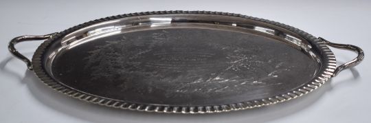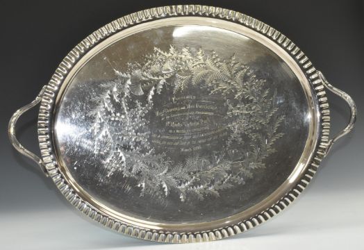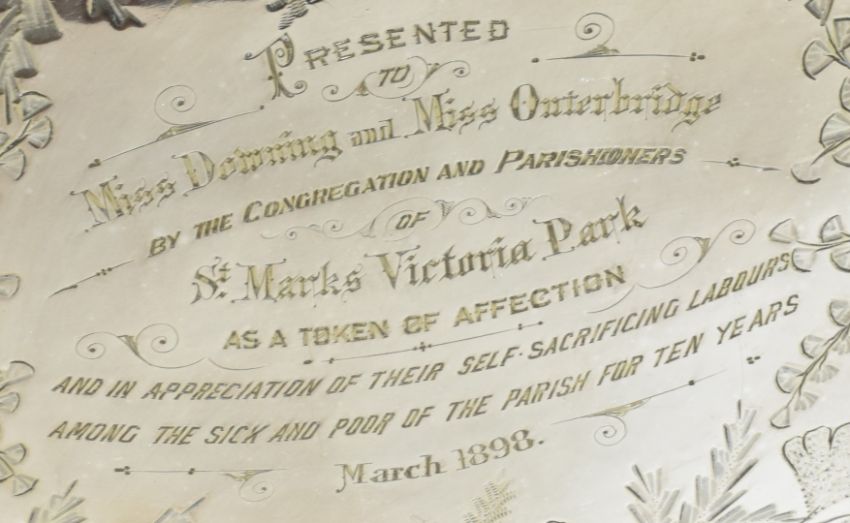 Suffragette interest - a silver plated twin handled tray with inscription 'Presented to Miss Downing and Miss Outerbridge by the Congregation and Parishioners of St Mark's, Victoria Park as a token of affection and in appreciation of their self-sacrificing labours among the sick and poor of the parish for ten years, March 1898'. Downing and Outerbridge both later received the WSPU Hunger Strike medal - see next lotFrances Outerbridge was born 1847 in Roath, Cardiff, to Stephen Arthur and Anne Outerbridge (nee Williams). Frances's paternal lineage is from an eminent Bermuda family and her uncle was Thaddeus Outerbridge, a prominent political figure and businessman in Bermudian society. In 1895/6, at the behest of his daughter the famous suffragette Anna Maria Outerbridge, Thaddeus Outerbridge unsuccessfully petitioned the Bermudian parliament for Suffrage, but although the bill to enfranchise women was passed in the house of assembly, it was defeated in the legislative council and the women of Bermuda had to wait until 1944 for the right to vote. It is hard to believe that the cousins Anna Maria and Frances Outerbridge were not in regular contact, given that they shared a common cause.Frances Outerbridge is later found in the 1891 Census aged 44 and living in the Bow district of London, in the same dwelling as Caroline Lowder Downing aged 35, both trained nurses. It appears the two women had a lifelong friendship. Caroline Lowder Downing is a Suffragette Hunger Strike medal recipient, her medal is held in the UK Parliamentary Art Collection. She was arrested in 1909, 1910 and 1911, and took part in a window smashing on 1st March 1912, for which she appeared at the London Bow St Sessions on the 19th March and was imprisoned in Winson Green Prison, Birmingham. Here she went on hunger strike and as was the common practice, was force fed (Winson Green was one of the first prisons to adopt this). It is highly likely that Frances Outerbridge took part in the same action due to the date on her medal being the same as Downing's, her name does not appear in any Suffragette records that we can find, leading us to believe she may have given a false name when arrested. Arrest records for the same day as Caroline Downing show a Frances Williams with identical arrest date and appearance at Bow Street, which suggests that Frances Outerbridge gave the name Frances Williams (using her mother's maiden name) when arrested, hence why, despite the naming on the medal, she does not appear in any official list of Hunger Strike medal recipients under her real name.This lot is consigned for sale by a direct descendant of Frances Outerbridge