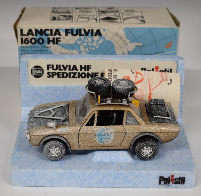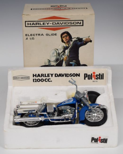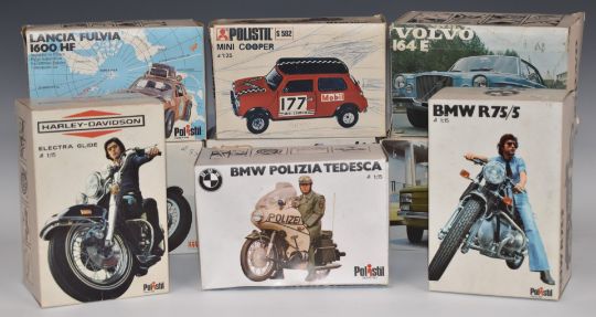 Nine Polistil 1:15 and 1:25 scale diecast model motorbikes and cars including BMW R75/5, Harley Davidson Electra Glide, Fiat 126 and Mini Cooper, all in original boxes.