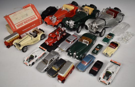 Twenty-two Corgi, Dinky, Burago, Franklin Mint, Lledo and similar diecast model vehicles including Streetscene Series, double decker buses, James Bond 007 Aston Martin DB5, glass cars etc.