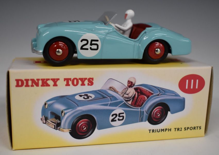 Ten The Classic Dinky Toys Collection diecast model vehicles including Aston Martin DB3 Sports 110, Triumph TR2 Sports 111, Cabriolet Ford 'Thunderbird' 555 etc, all in original boxes together with related magazines in binder.
