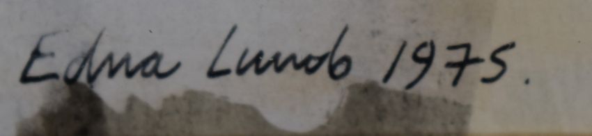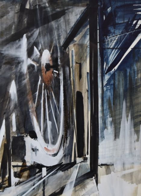 Edna Lumb (1931-1992) watercolour mine pit gear or similar wheel, signed and dated 1975 lower right, 58 x 41cm, in polished metal frame
