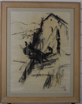 Garth B Scott, pupil of David Bomberg and part of the Borough group, abstract charcoal architectural study 'San Francesca', initialled and dated 65 lower right, 61 x 45cm, with labels verso