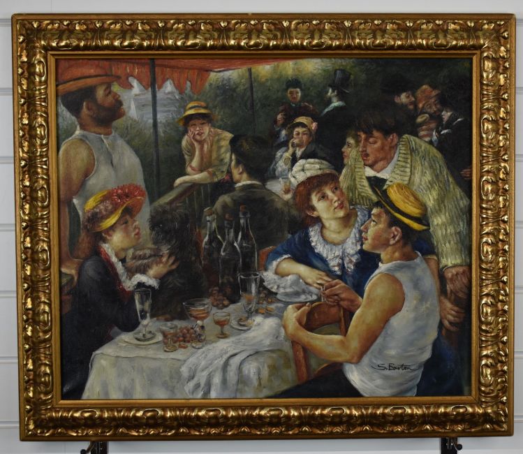S Earton oil on canvas garden party after Renoir, together with a still life by the same artist, larger 49.5 x 60cm
