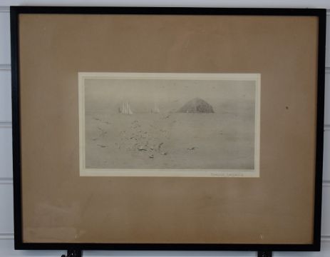 Rowland Langmaid etching of Ailsa Craig in the Firth of Forth, with sailing boats and sea birds, blind stamp lower left, 18 x 31cm, in black painted frame